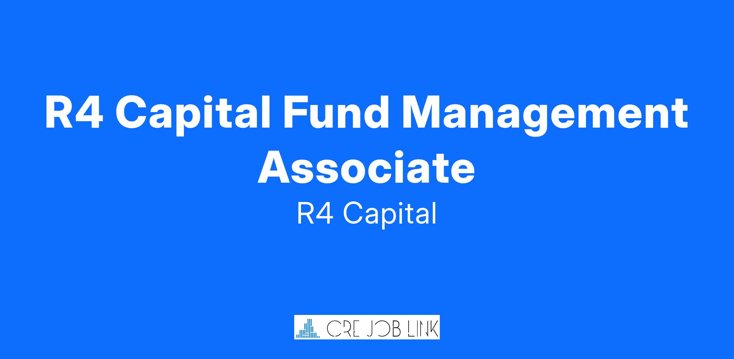 Job Description: R4 Capital LLC (R4) seeks to hire an Associate for its institutional equity Fund Management Team, who are responsible for the structuring, capital raising, closing, management, and investor reporting of a nationwide affordable multifamily housing investment platform.